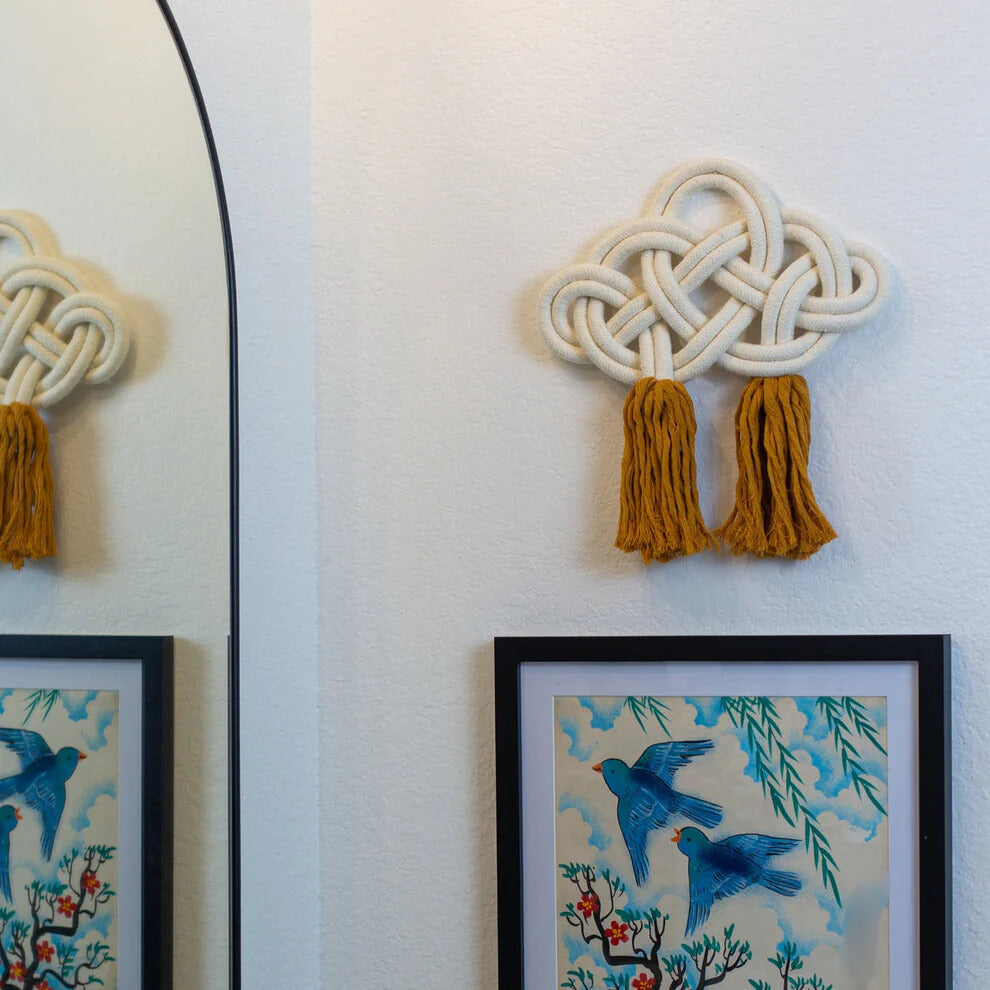 The fair trade Infinity Knot Wall Hanging features a beautifully unique knot handmade from cream colored cotton rope. It is a stunning addition to any hallway, dining room, or gallery wall display. The colorful cotton tassels add a bit of fun to this elegant handcrafted piece. The size is perfect for a small space like a powder room, reading nook, or nursery.